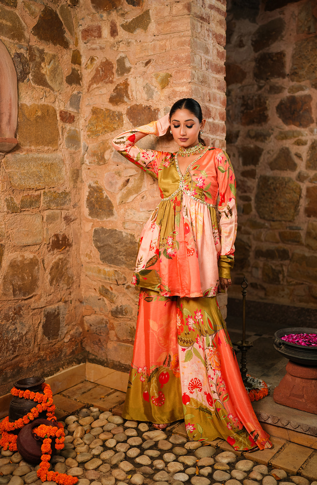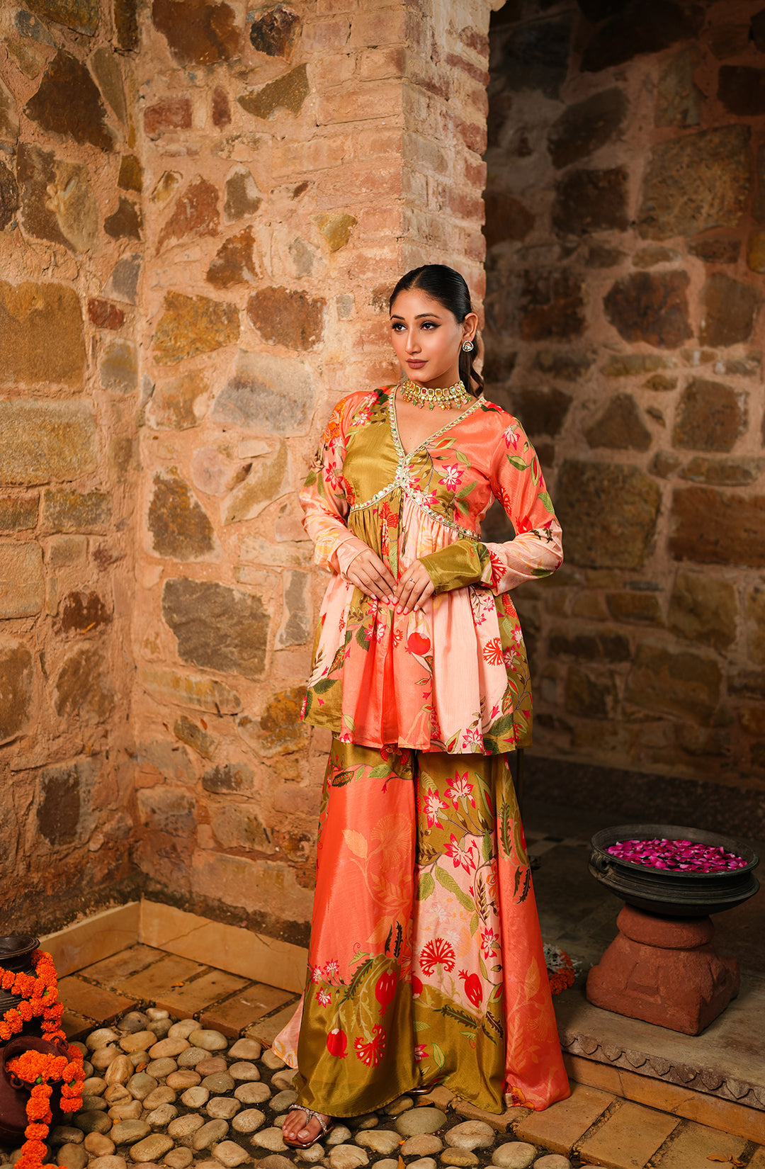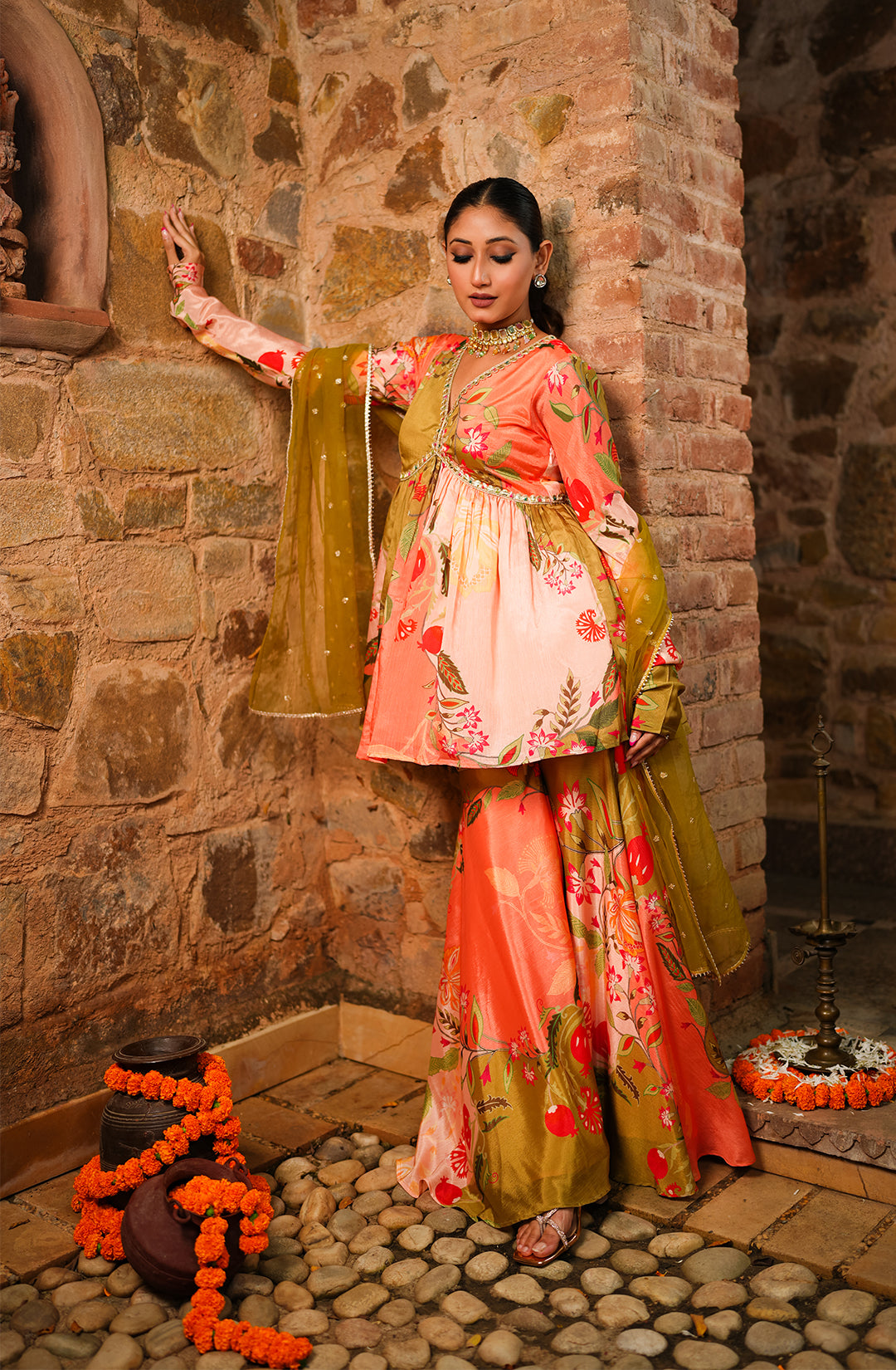 Brighten your festive wardrobe with the Gulbagh Sharara Set, a vibrant ensemble crafted from premium quality Chinon with striking floral prints. This set includes a peplum-style kurta adorned with intricate lace detailing, paired with flared sharara pants. The relaxed fit ensures comfort and elegance, making it ideal for special occasions.
