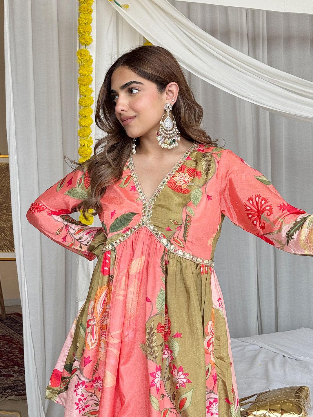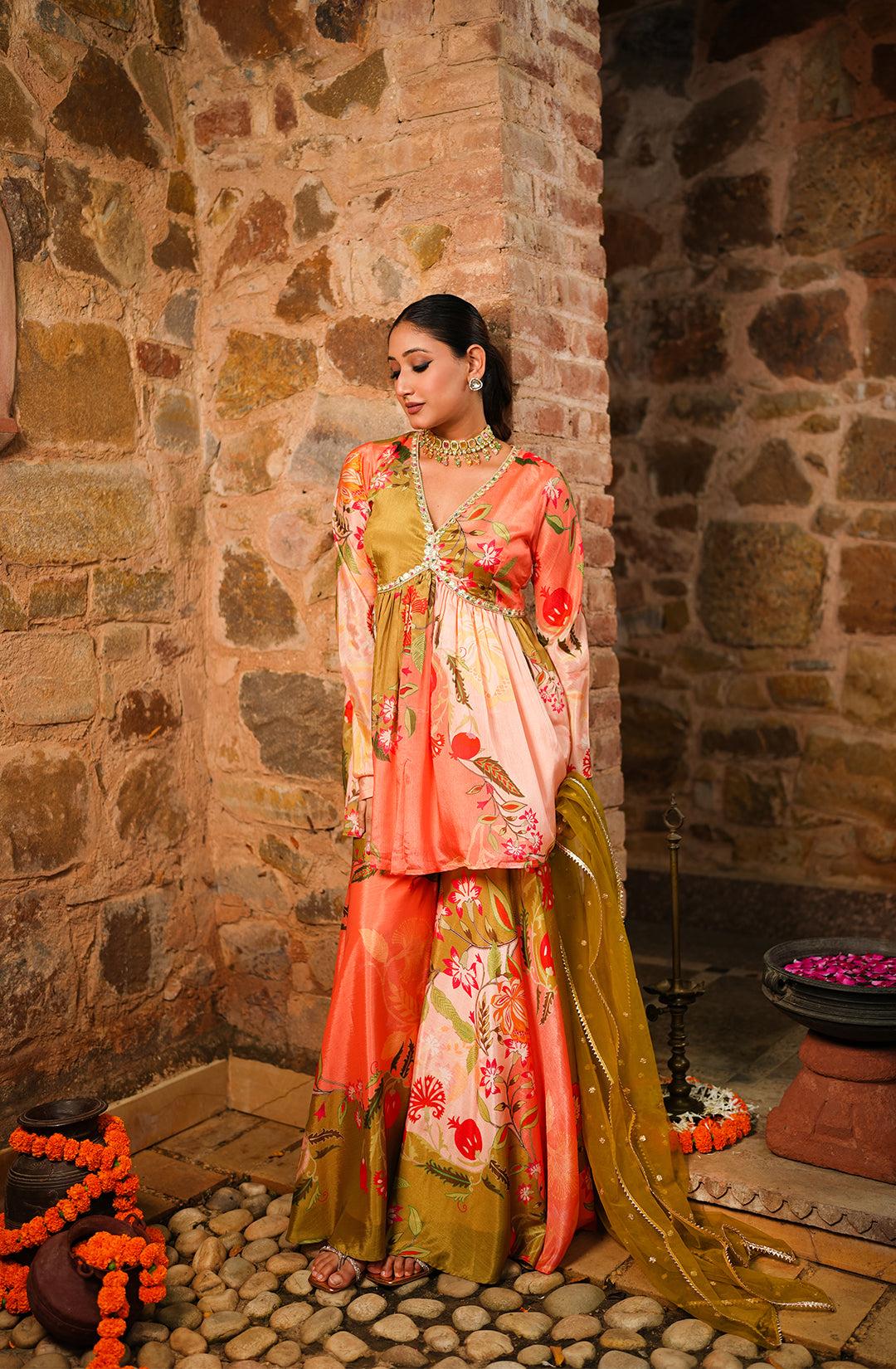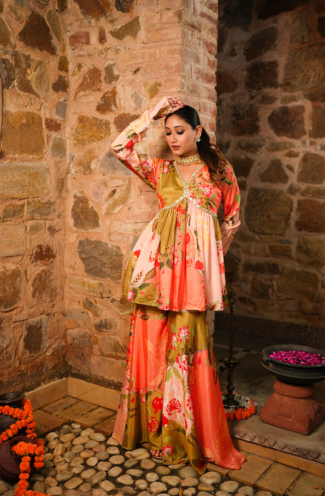 Brighten your festive wardrobe with the Gulbagh Sharara Set, a vibrant ensemble crafted from premium quality Chinon with striking floral prints. This set includes a peplum-style kurta adorned with intricate lace detailing, paired with flared sharara pants. The relaxed fit ensures comfort and elegance, making it ideal for special occasions.