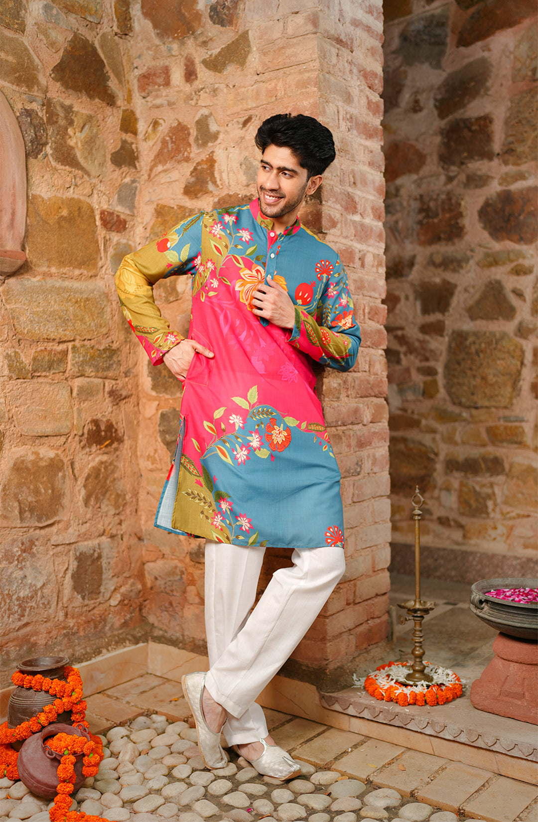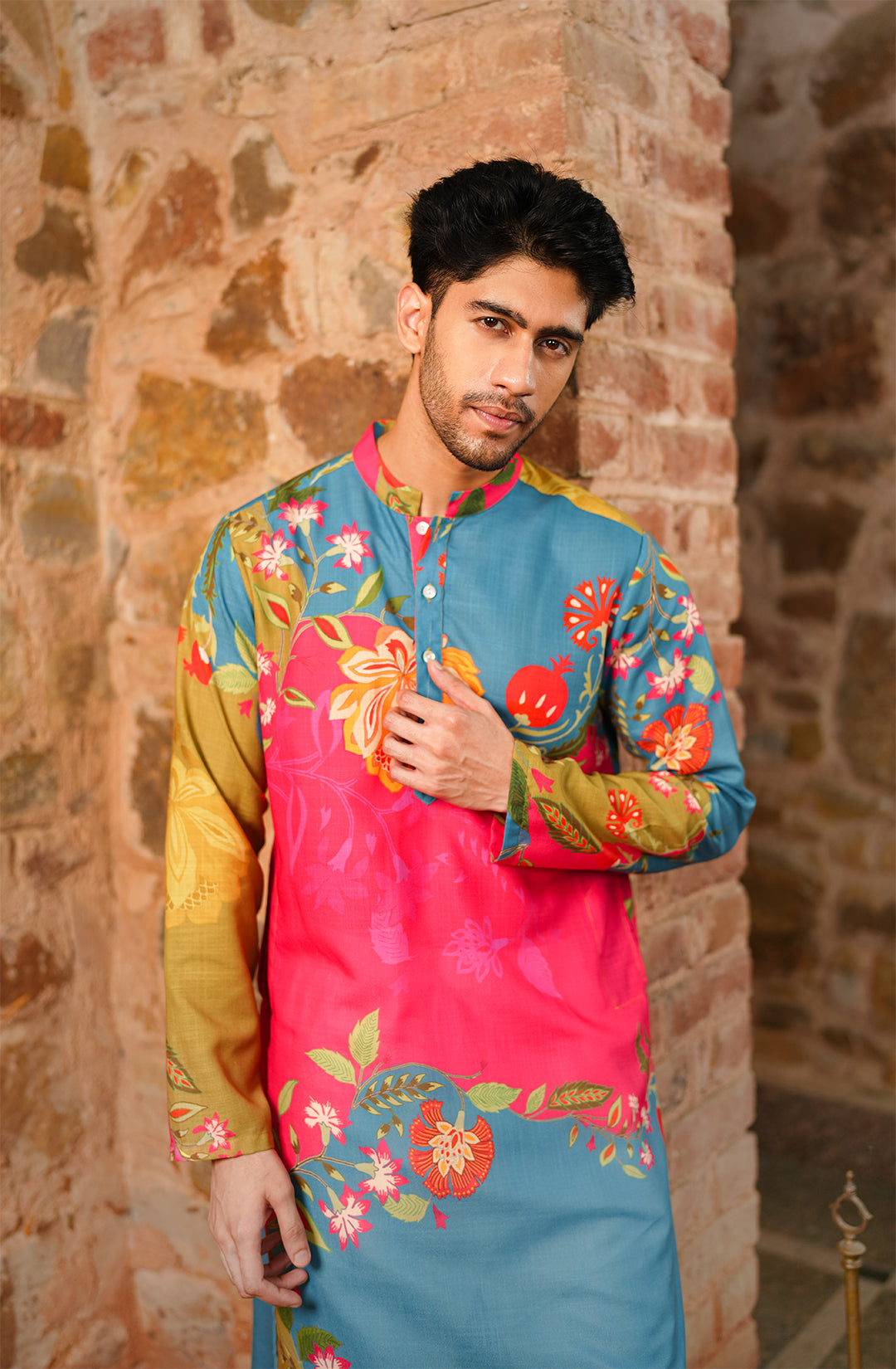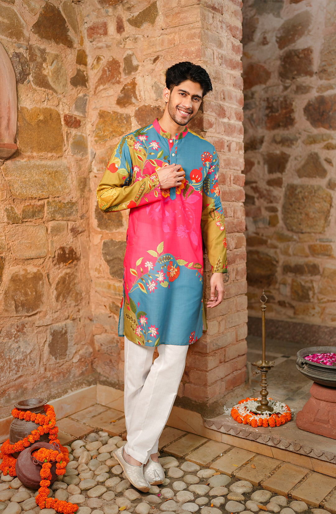 Elevate your festive style with this vibrant Men's Kurta, made from premium Kurta Slub for comfort and breathability. Featuring bold floral prints and a relaxed fit, this kurta is perfect for traditional celebrations or casual gatherings. With two practical pockets, it combines functionality with style.
