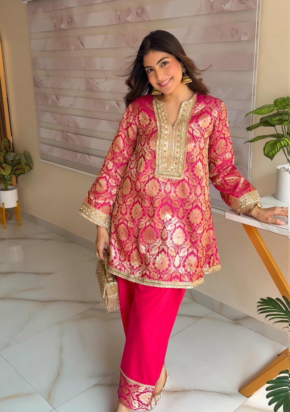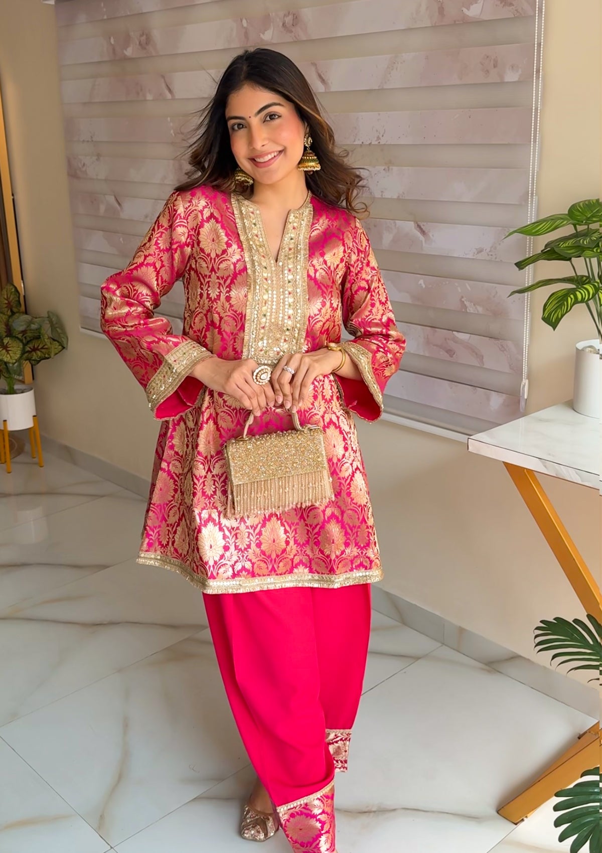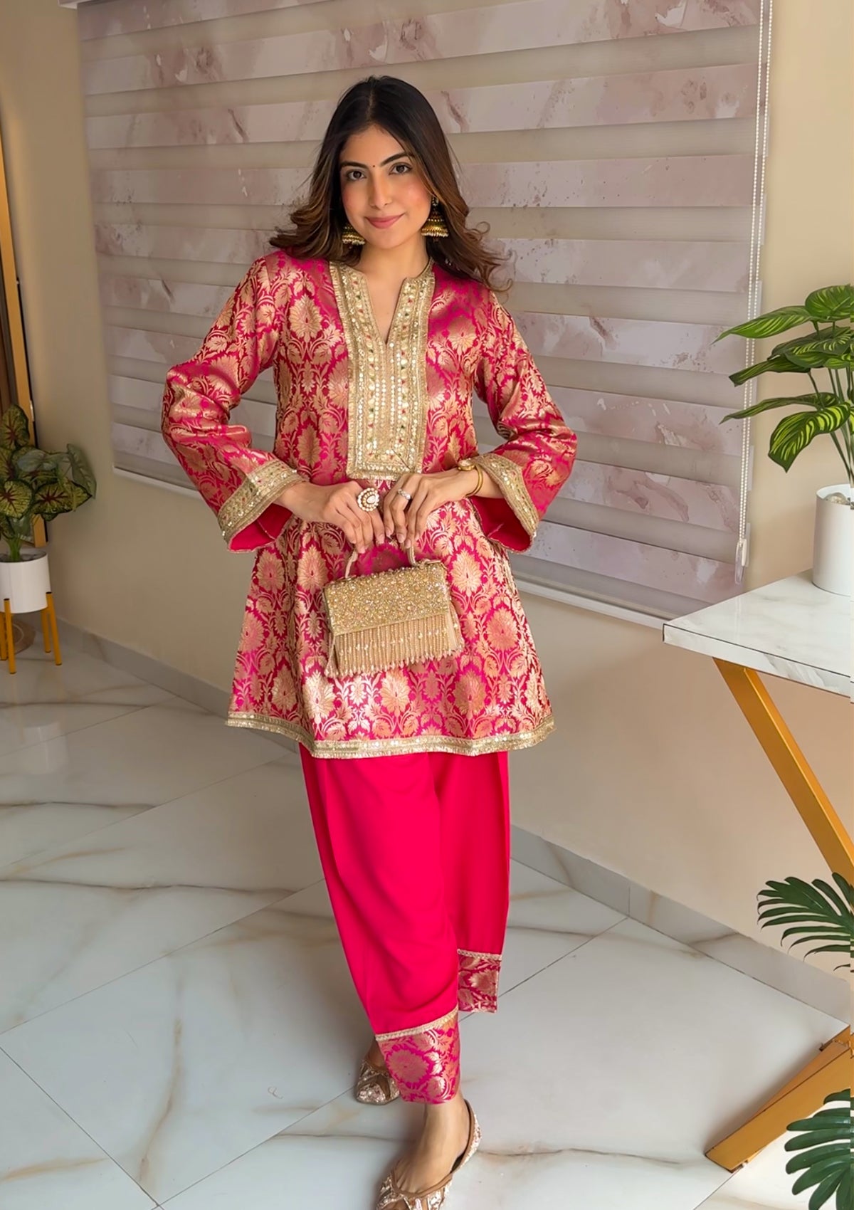 Step into festive elegance with the Rani Co-Ord Set in Pink, a luxurious creation woven from fine Banarasi brocade. The intricate golden motifs add a regal touch, while the soft sheen of the fabric elevates your look with understated sophistication. Designed in a relaxed silhouette, this ensemble ensures both comfort and grandeur - a perfect pick for wedding festivities and celebratory evenings.